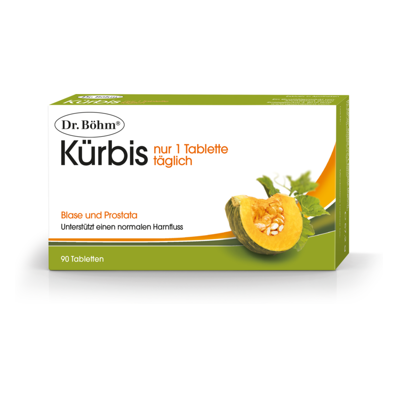 Dr. Böhm® Kürbis nur 1 x täglich unterstützt Ihre Blase und Prostata mit dem 20-fach-konzentrierten Extrakt aus steirischen Kürbiskernen und trägt so zu einem normalen Harnfluss bei. Bereits eine Tablette liefert Ihnen zur Prostataunterstützung die wertvollen Inhaltsstoffe von 10 g Kürbiskernen (entspricht 50 Kürbiskernen). Die beste Unterstützung für eine gesunde Prostata erzielen Sie, wenn Sie Dr. Böhm® Kürbis nur 1 x täglich über einen längeren Zeitraum hinweg einnehmen.