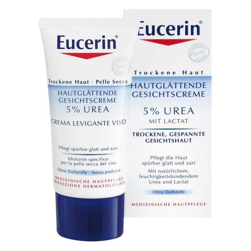 Eucerin Hautglättende Gesichtscreme 5% Urea ist eine schnell einziehende Feuchtigkeitspflege für jeden Tag bei trockener bis sehr trockener, zu Schuppung und Spannungsgefühl neigender Haut. Angereichert mit Urea und Lactat, zwei natürlichen, feuchtigkeitsbindenden Präparaten versorgt die Creme trockene Gesichtshaut sofort mit Feuchtigkeit. Das lindert das Spannungsgefühl und macht die Haut spürbar glatter und geschmeidiger. Raue Haut entsteht in der Regel auch durch Feuchtigkeitsmangel. Eucerin Hautglättende Gesichtscreme 5% Urea bewahrt die Hautfeuchtigkeit und raue Haut wird glatter. Sie ist ideal als Make-up-Grundlage oder nach dem Rasieren geeignet. Auch bei Psoriasis und Altershaut geeignet