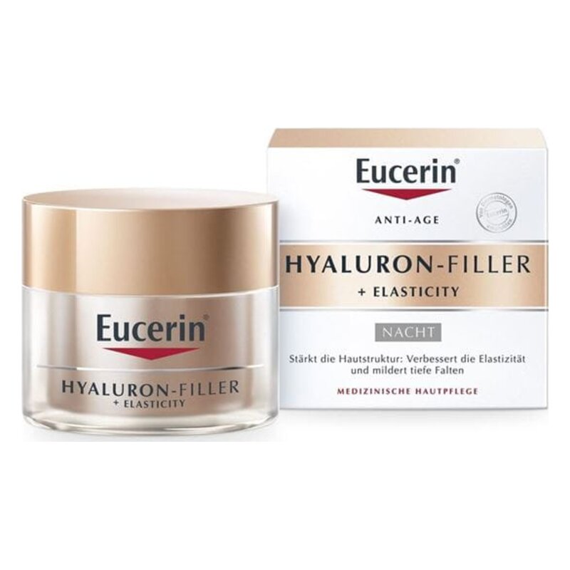 Die Eucerin HYALURON-FILLER + ELASTICITY Nachtpflege stärkt die Hautstruktur, indem sie ihre Elastizität verbessert und tiefe Falten mildert.
