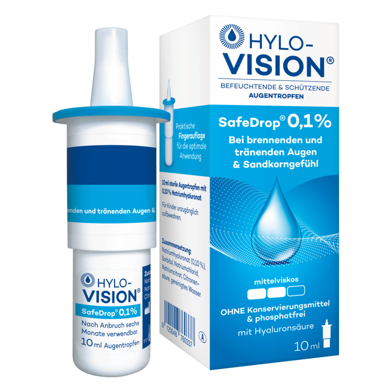 Hylo-Vision® SafeDrop® 0,1% ist ein steriles, phosphatfreies und mittelviskoses Benetzungsmittel im innovativen SafeDrop®-System, einem von OmniVision mitentwickelten, konservierungsmittelfreien Mehrdosenbehältnis. Mit Hilfe der praktischen breiten Fingerauflage kann es optimal angewendet werden.