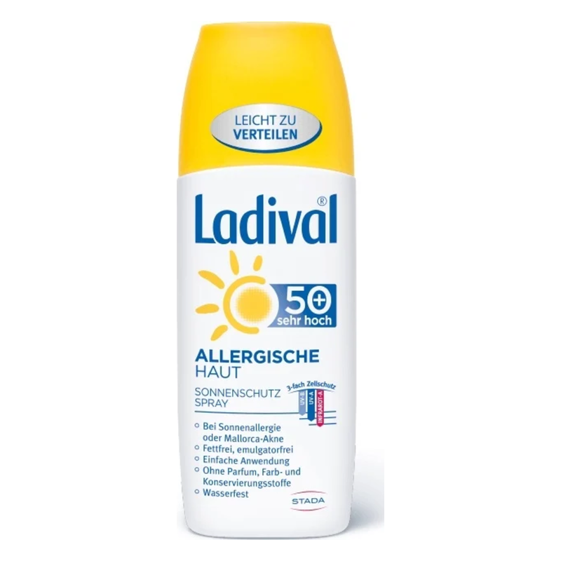 Das besonders leichte Ladival Allergische Haut Sonnenschutz Spray enthält weder Fette noch Emulgatoren. Es ist speziell geeignet bei Neigung zu Sonnenallergie oder Mallorca-Akne, aber auch bei einer eher fettigen Haut.