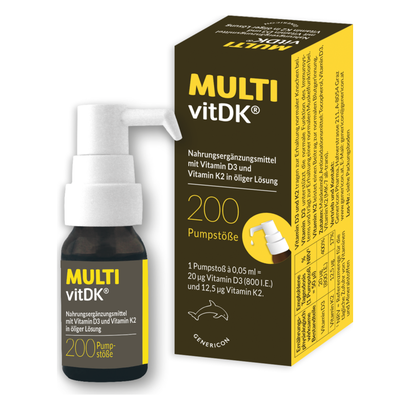 MULTIvitDK® vereint Vitamin D3 und K2 in einer hochwertigen, geschmacksneutralen Lösung auf Basis von hochreinem Maiskeimöl.