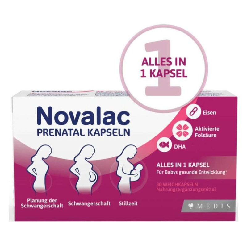 Novalac Prenatal Kapseln enthalten keine TiO2, Laktose, Gluten oder GVO.