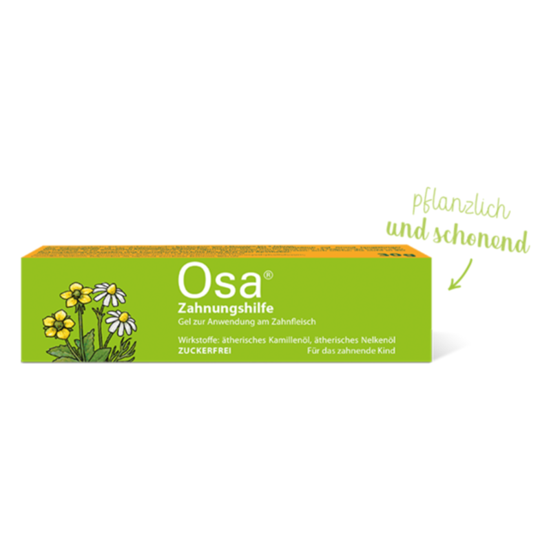 Osa Zahnungshilfe ist ein traditionelles pflanzliches Arzneimittel zur Anwendung bei Zahnungsbeschwerden von Kleinkindern ab dem vollendeten 3. Monat bis zum 4. Jahr. Die Anwendung dieses traditionellen pflanzlichen Arzneimittels im genannten Anwendungsgebiet beruht ausschließlich auf langjähriger Verwendung.